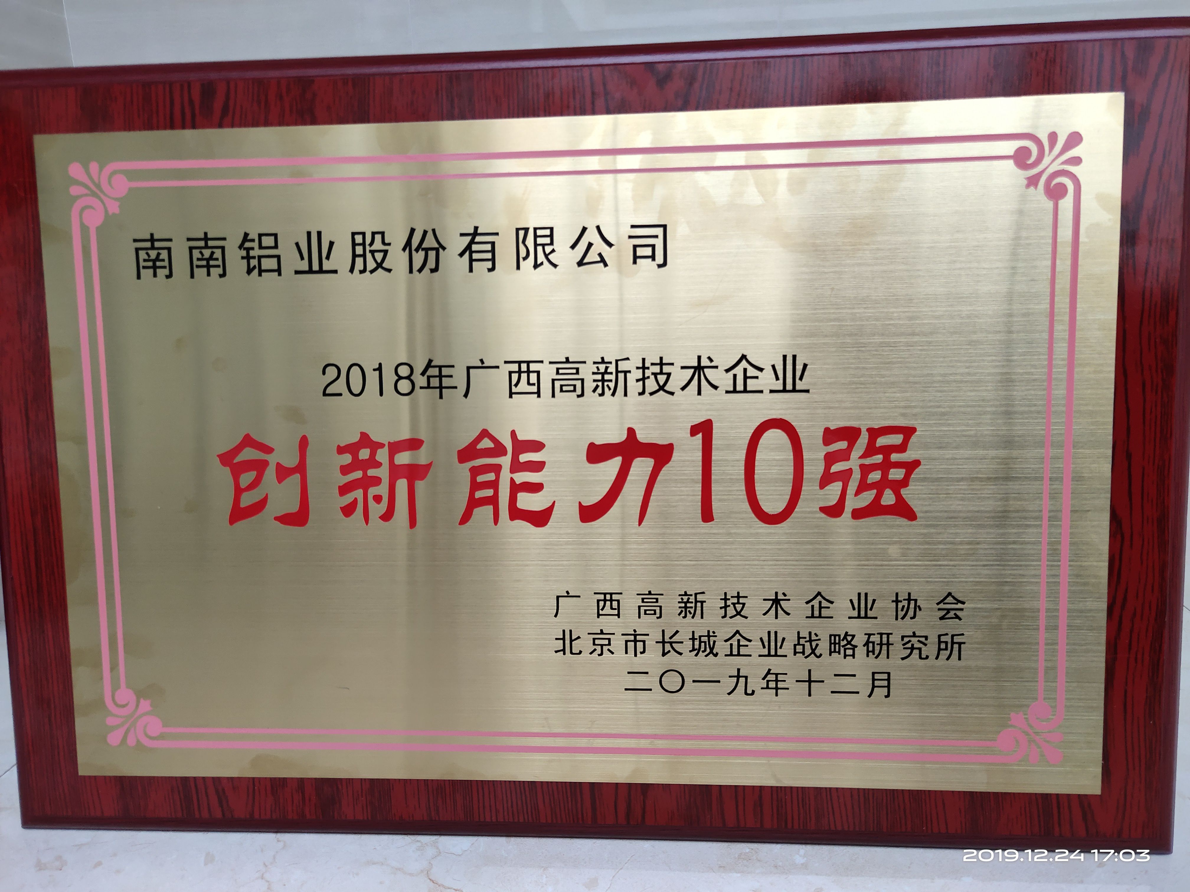 2019年12月24日,廣西高新技術(shù)企業(yè)百強、創(chuàng)新能力十強、創(chuàng)新活力十強企業(yè)榜單發(fā)布會在南寧舉行,這是廣西首次評選發(fā)布廣西高新技術(shù)企業(yè)榜單。我公司榮獲廣西高新技術(shù)企業(yè)百強、創(chuàng)新能力十強兩項榮譽獎,南南鋁人力資源總監(jiān)吳津生代表公司上臺領(lǐng)獎。