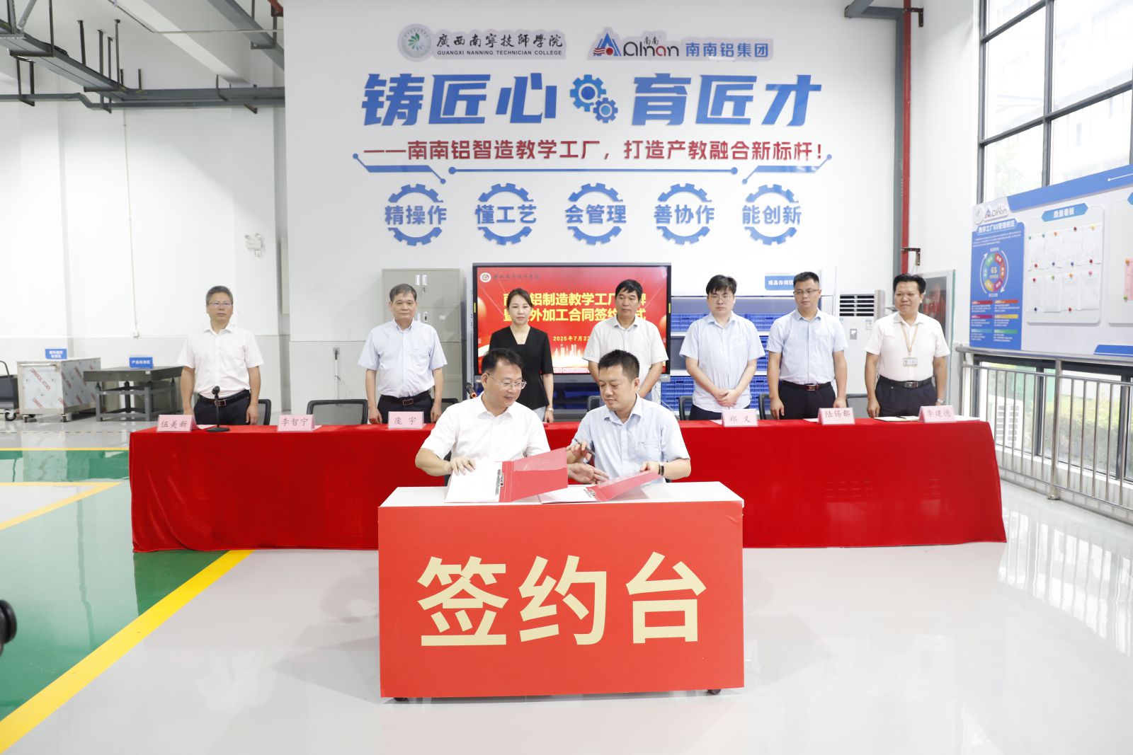 ? ? ? 7月22日,廣西南寧技師學(xué)院“南南鋁智造教學(xué)工廠”正式揭牌啟用。南南鋁業(yè)與該學(xué)院同步簽署委外加工合同,確認(rèn)首批批量產(chǎn)訂單,標(biāo)志著南南鋁業(yè)在深化產(chǎn)教融合、構(gòu)建技能人才培育生態(tài)體系上邁出關(guān)鍵一步,為企業(yè)高質(zhì)量發(fā)展注入人才新動(dòng)能。